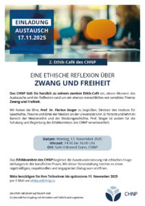 Das CHNP lädt herzlich zu seinem zweiten Ethik-Café ein – einem Moment des Austauschs und der reflektierten Diskussion über ein ebenso menschliches wie sensibles Thema: Zwang und Freiheit.Wir haben die Ehre, Prof. Dr. Florian Steger, Direktor des Instituts für Geschichte, Theorie und Ethik der Medizin an der Universität Ulm, begrüßen zu dürfen. Er forscht und lehrt im Bereich der Medizinethik und der Medizingeschichte und begleitet zudem die Schulung und Reflexion des Ethik-Komitees des CHNP.📅 Datum: Montag, 17. November 2025 🕑 Uhrzeit: 14:00 – 16:00 Uhr 📍 Ort: Salle Edmond Dune, CHNP, Ettelbruck (bâtiment 13) 🗣️ Sprache: Deutsch📧 Bitte bestätigen Sie Ihre Teilnahme bis zum 11. November 2025 per E-Mail an: ethique@chnp.lu